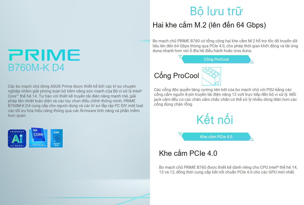 Bo mạch chủ Asus B760M-K được thiết kế chuyên nghiệp nhằm giải phóng toàn bộ hiệu năng của bộ vi xử lý Intel thế hệ 14. Với 2 khe cắm M.2, Khe PCIe 4,0, cổng Sata3 người dùng thoải mái lựa chọn cầu hình phù hợp với nhu cầu của công việc.