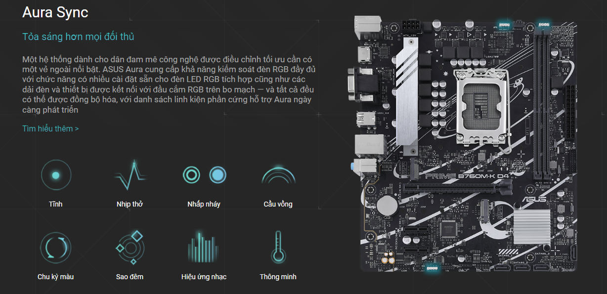 Led (RGB): mainboad trang bị thêm tính năng Aura Sync giúp cho bạn tạo lên được phong cách cá nhân độc đáo, riêng biệt thỏa mãn đam mê công nghê. Aura RGB cung cấp đầy đủ các hiệu ứng, màu sắc và cả khả năng đồng bộ âm nhạc với ánh sáng, hoạt động hoặc trò chơi,…